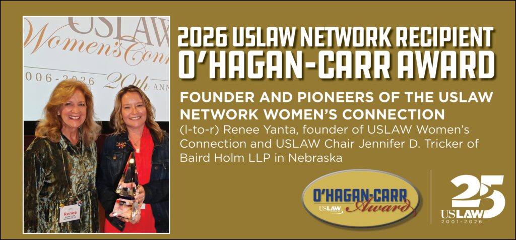 “The USLAW Women’s Connection has become one of the most successful programs within USLAW, and it is fitting to recognize its founder and early leaders with the 2026 USLAW NETWORK O’Hagan-Carr Award,” said Jennifer D. Tricker, Chair of USLAW NETWORK from Baird Holm LLP in Nebraska. “We are grateful for the many individuals who served as the initial catalyst to create, develop, inspire and spark this remarkable USLAW community.”